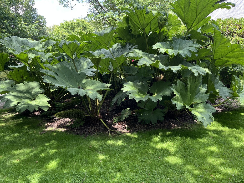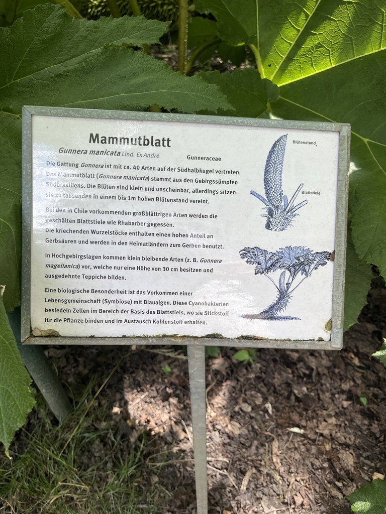 Die Gattung Gunnera ist mit 40 Arten auf der Südhalbkugel vertreten. Das Mammutblatt ist eine bis zu drei Meter große mehrjährige, krautige Pflanze. Sie wird auch Riesen-Rhabarber genannt, da die Wuchsform Ähnlichkeit mit dem Rhabarber (Rheum rhabarbarum) aufweist, sie ist jedoch nicht verwandt mit diesem. (Wikipedia) Die Blütezeit ist von Juli bis August.